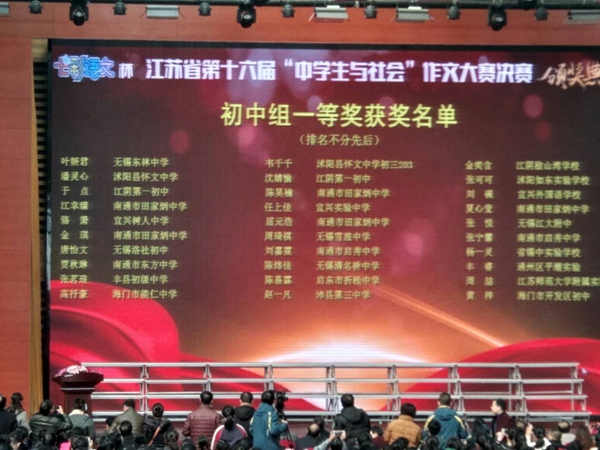 江苏省教育学会中语会、江苏省中小学教学研究室、《七彩语文》杂志社联合主办的“七彩语文杯”江苏省十六届“中学生与社会”作文大赛省级决赛于2017年12月2日在南京市金陵中学河西分校举行。我校贾秋琳同学荣获初中组一等奖(指导老师 徐东),张韵、徐施诗、于乐三位同学均获得初中组二等奖(指导老师分别是顾惠、蔡天翼、何忠伟)。这四位同学不久前参加了在南通市跃龙中学举行的市级中学生作文大赛中,均获得南通市(大市)作文大赛初中组一等奖。这是我校在分层走班教学改革探索中所取得的又一个新的成果。(徐东)