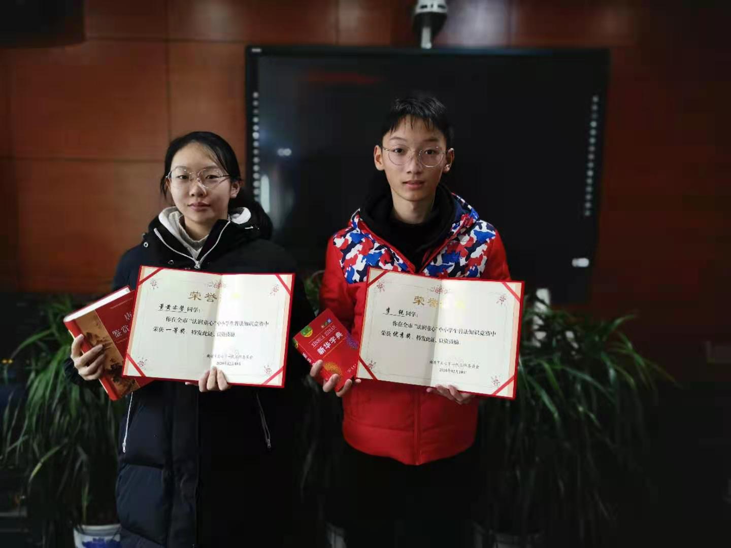 近日,接南通市关工委通知,我校初三年级董黄亦馨同学获得南通市中小学生普法知识竞赛一等奖、李锐同学获得南通市中小学生普法知识竞赛优秀奖,向这两位学生表示祝贺!