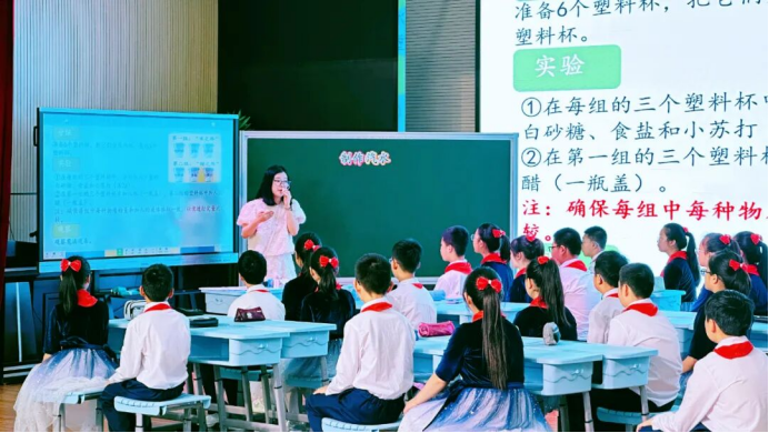 本次活动还呈现了三节精彩示范课。第一节课由南通市竹行小学的陈钰琴老师执教六年级《制作汽水》。在教学中,学生通过动手实践,探究白醋与小苏打反应会产生二氧化碳,并自制柠檬汽水。课堂融合实验观察、科学验证与生活应用,既让学生掌握了汽水制作方法,又培养了科学思维。最后,通过对比市售汽水,引导学生关注健康饮食。整节课寓教于乐,展现了创新教学的魅力。