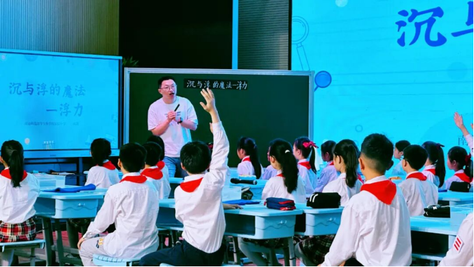 第二节课由南通师范高等专科学校实验小学的陆剑老师执教四年级《沉与浮的魔法》。这堂课就像一场科学探秘之旅,带学生解锁浮力“密码”。通过PhET模拟器魔法展示、亲手压瓶感受托力、弹簧测力计测下沉石块浮力等趣味实验,破解“沉浮谜团”,还能揭秘质量与体积对沉浮的影响,全程充满探索乐趣与团队协作的火花!
